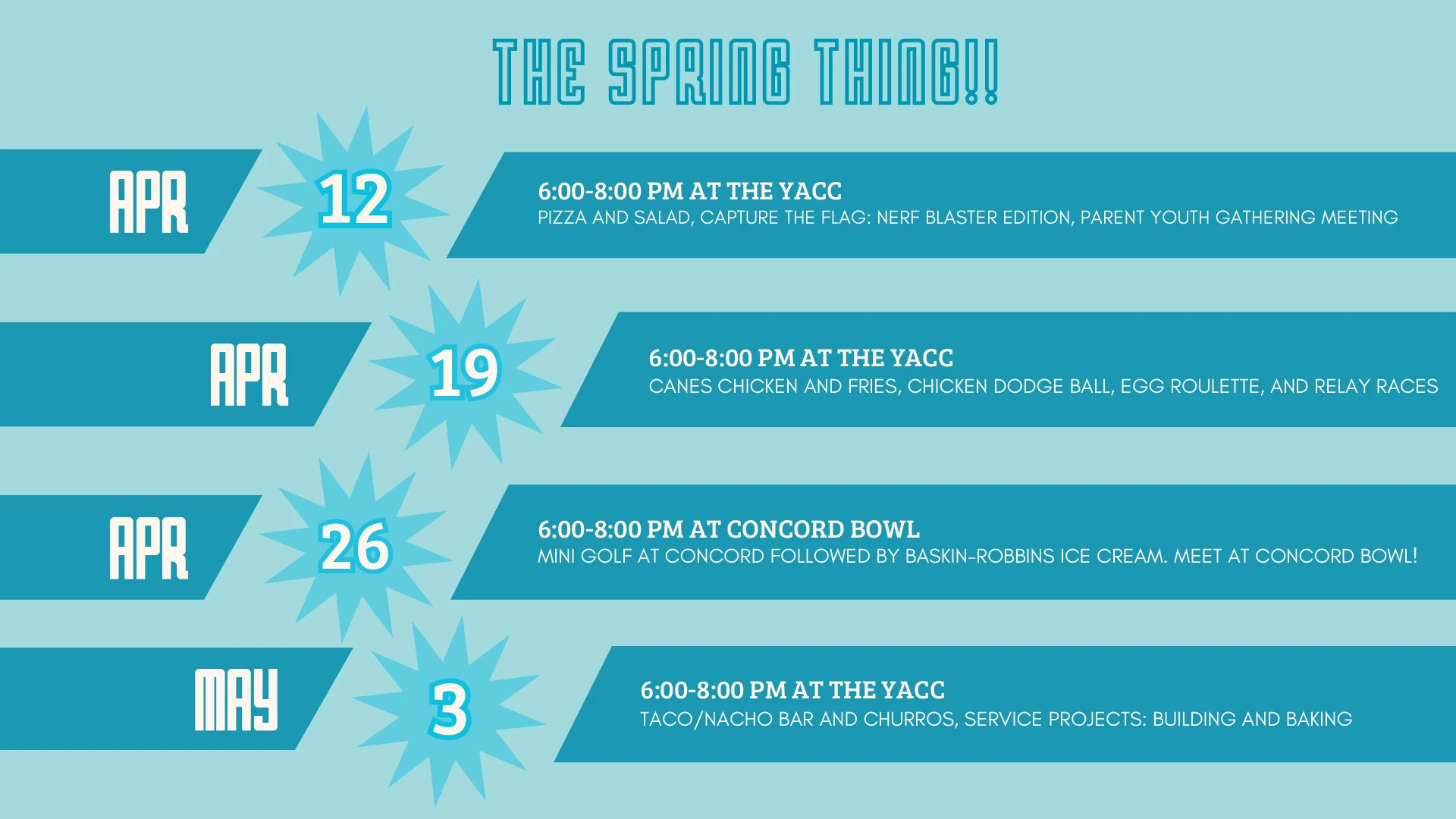 - APRIL 12, 6:00-8:00 PM at the YaCC - Pizza and salad, capture the flag: Nerf blaster edition, parent youth gathering meeting.